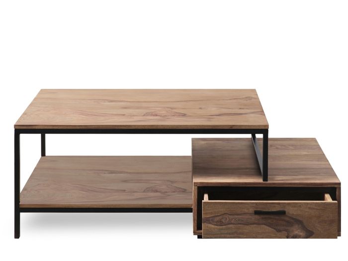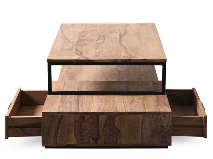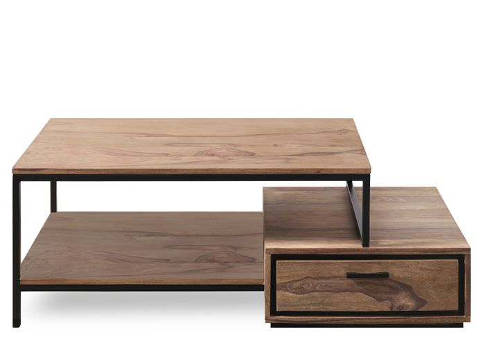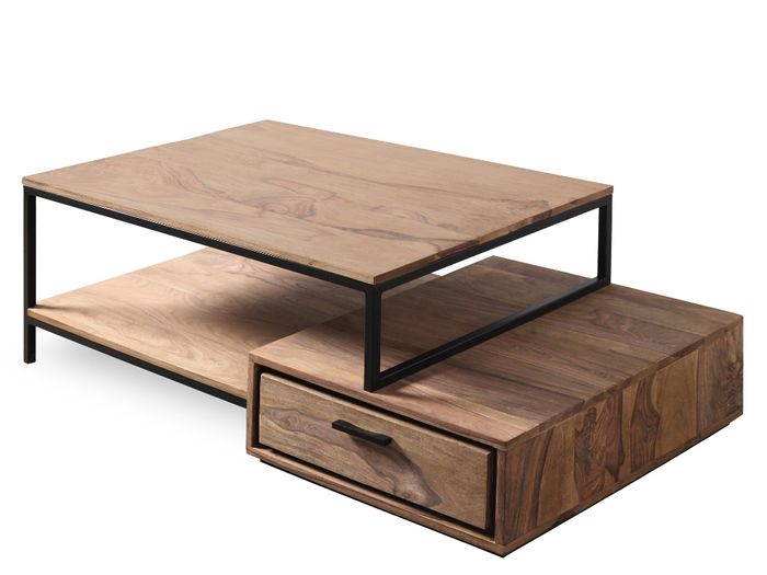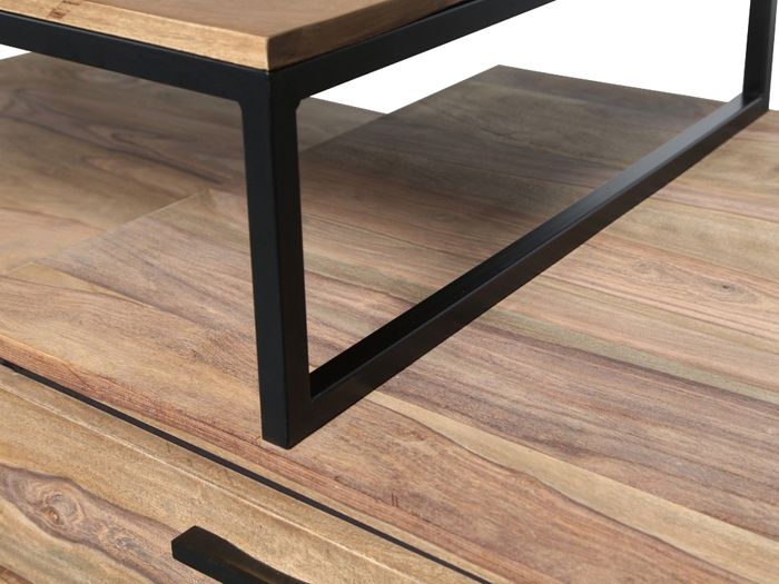 Der BRICK Couchtisch kombiniert markantes Design mit funktionalem Stauraum. Gefertigt aus massivem Shishamholz und stabil eingefasst in ein schwarzes Metallgestell, bringt er Wärme und Struktur in den Wohnbereich. Mit seiner zweistufigen Ablagefläche und der beidseitig öffnenden Schublade bietet der Tisch viel Platz für Zeitschriften, Fernbedienungen oder Deko – und überzeugt dabei durch seinen modernen Industrial-Look. Ein ausdrucksstarker Mittelpunkt für jedes Wohnzimmer – funktional, edel und unverwechselbar.