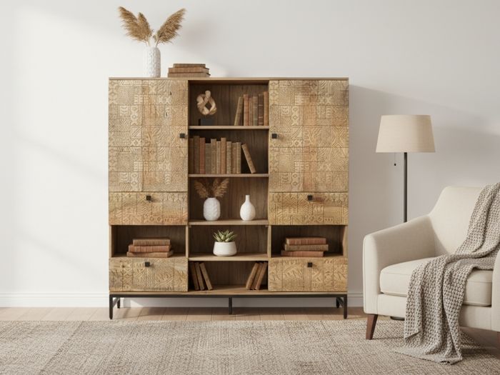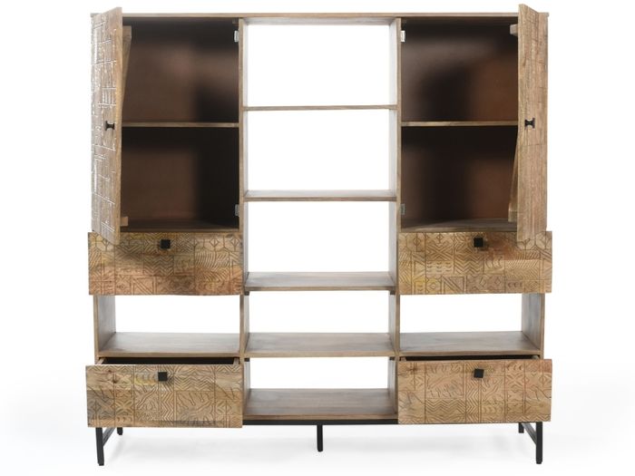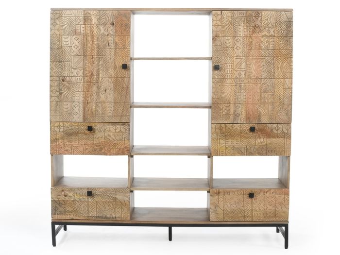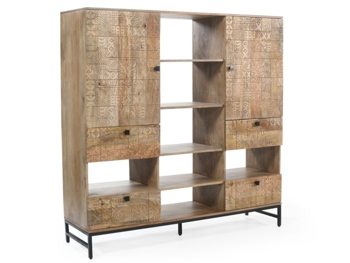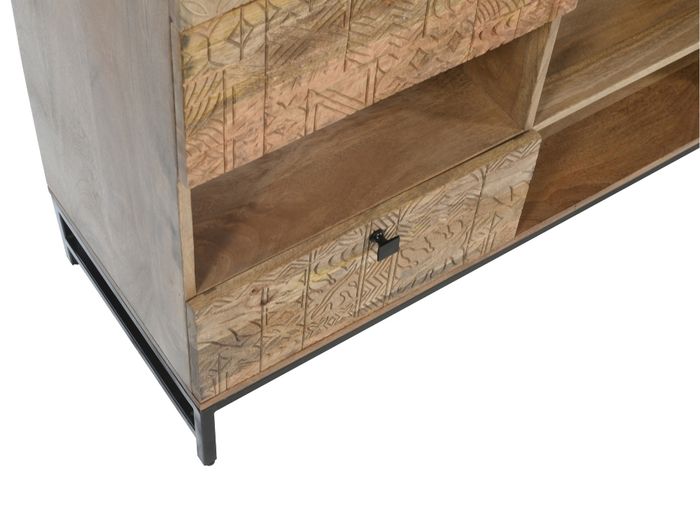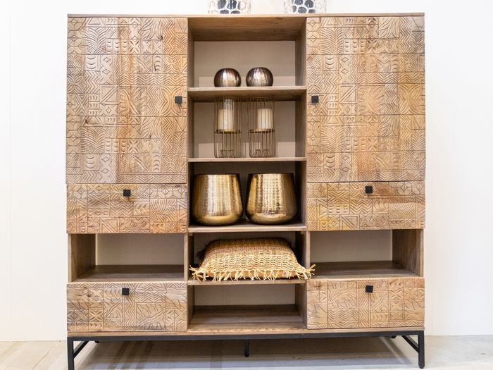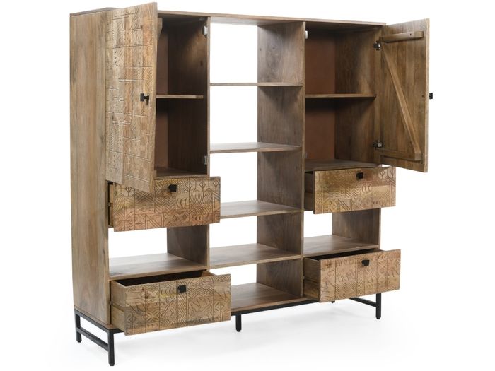Das Highboard aus der CARVING-Kollektion vereint ausdrucksstarkes Design und Funktionalität. Handgefertigt aus massivem Mangoholz, begeistert es durch die aufwendigen 3D-Muster auf den Fronten – jedes Stück ist ein echtes Unikat. Mit 2 Türen, 4 Schubladen und offenen Ablagen, die sich ideal auch als Flaschenhalter nutzen lassen, bietet das Highboard großzügigen Stauraum und vielfältige Nutzungsmöglichkeiten – ob im Esszimmer, Wohnzimmer oder Flur. Das schwarze Metallgestell sorgt für einen modernen Kontrast und hohe Stabilität. Wie alle Möbel der Serie wird auch dieses Schmuckstück fertig montiert geliefert – stilvoll, praktisch und sofort einsatzbereit.