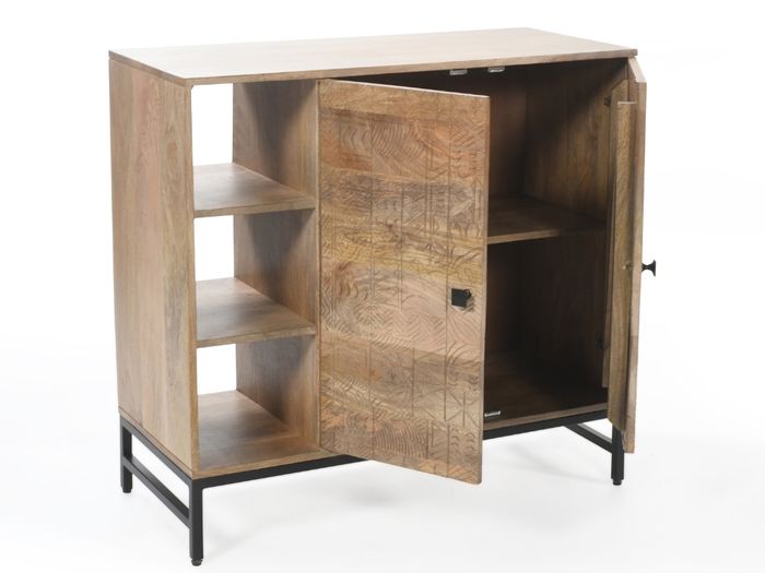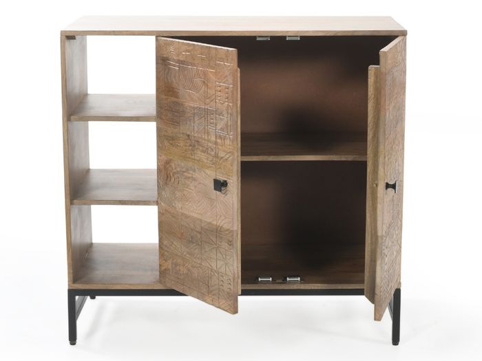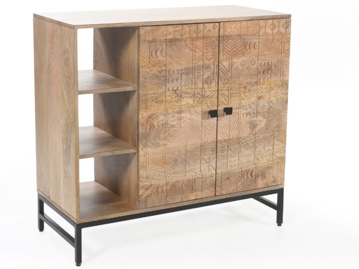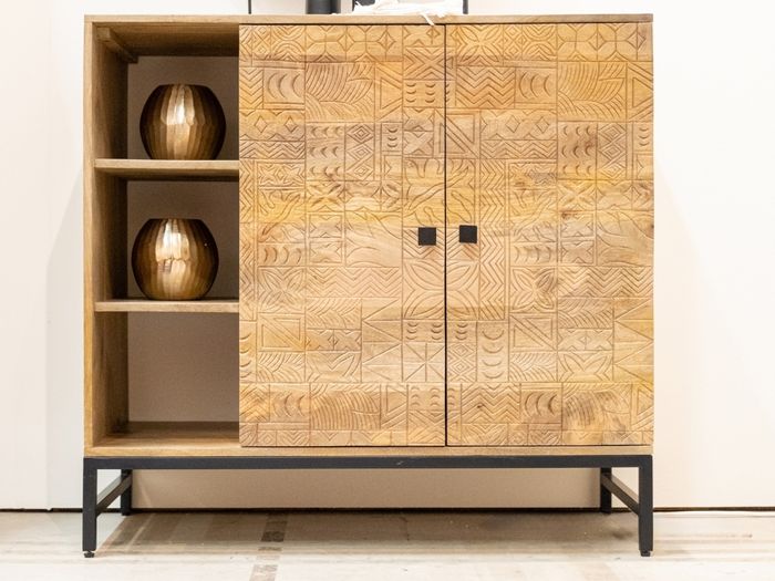 Diese elegante Kommode aus der CARVING-Kollektion kombiniert natürliches Design mit kunstvoller Handarbeit. Gefertigt aus massivem Mangoholz, überzeugt sie durch ihre warme Ausstrahlung und die aufwendigen 3D-Muster auf den Fronten – jedes Stück ein Unikat. Mit 2 Türen und offenen Ablagen bietet die Kommode praktischen Stauraum und gleichzeitig Platz für dekorative Akzente. Das schwarze Metallgestell sorgt für Stabilität und verleiht dem Möbel eine moderne, leichte Optik. Die Kommode wird fertig montiert geliefert – für ein sofortiges Einrichtungserlebnis voller Natürlichkeit und Stil.