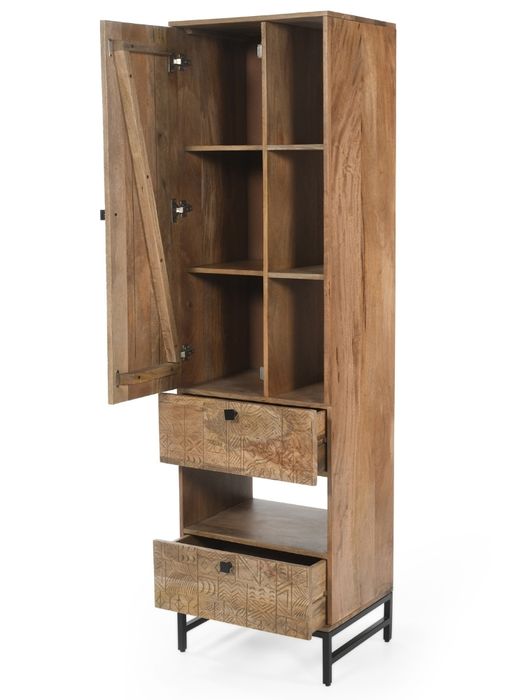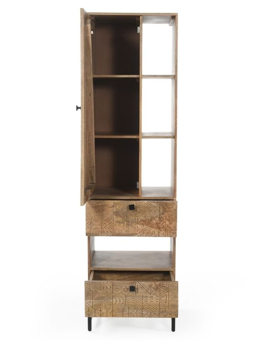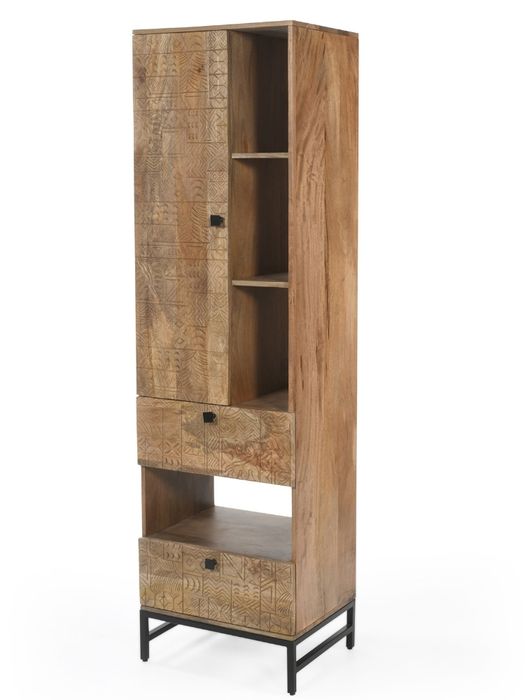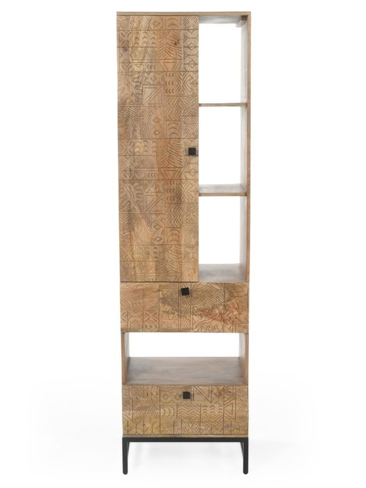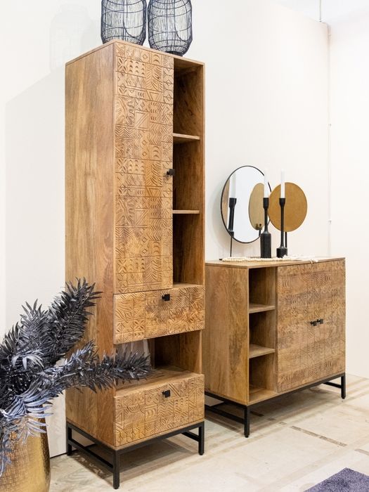 Dieses stilvolle Regal aus der CARVING-Kollektion vereint handwerkliche Kunst und modernes Design. Gefertigt aus massivem Mangoholz, beeindruckt es mit einer natürlichen Maserung und aufwendigen 3D-Mustern auf der Tür- und Schubladenfront. Das Regal bietet mit 1 Tür, 2 Schubladen und 4 offenen Ablagen vielfältige Möglichkeiten zur Aufbewahrung und Präsentation. Ob Bücher, Deko oder Alltagsgegenstände – hier findet alles seinen Platz. Das schwarze Metallgestell sorgt für Stabilität und einen modernen Touch. Wie alle Möbel der Serie wird auch dieses Regal fertig montiert geliefert – sofort bereit, Ihr Zuhause zu bereichern.