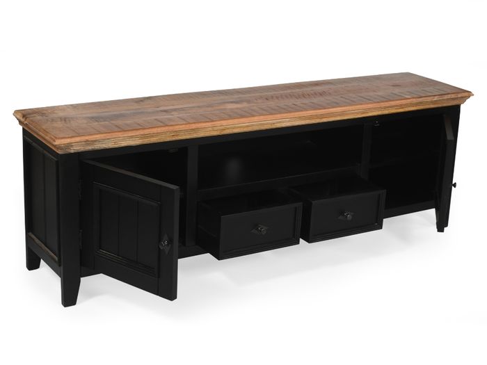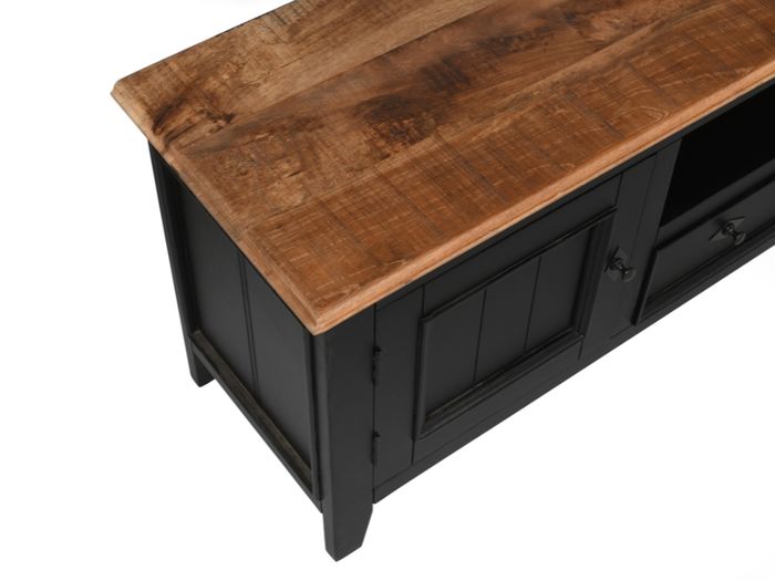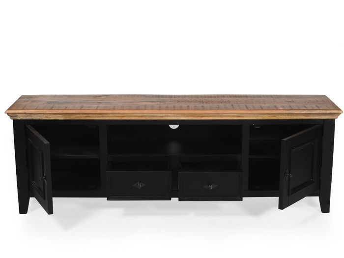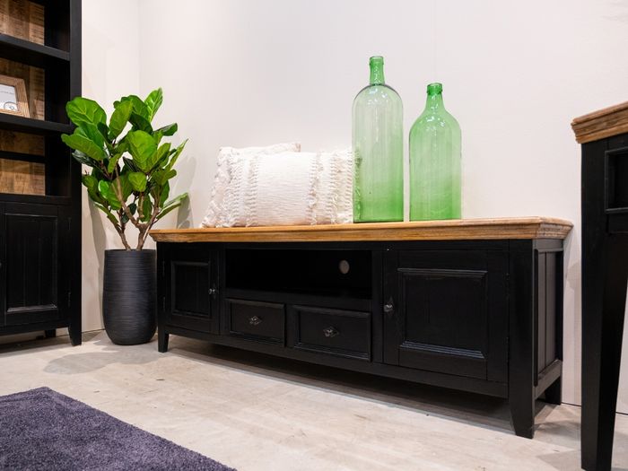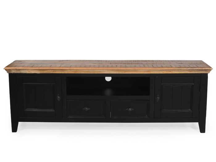 Das COUNTRY Lowboard vereint zeitlose Schönheit mit praktischer Funktionalität. Gefertigt aus massivem Mangoholz und veredelt mit einer naturbelassenen Holzplatte, strahlt dieses Möbelstück Wärme und Charakter aus. Der schwarz lackierte Korpus sorgt für modernen Kontrast – perfekt, um Fernseher, Deko und Mediengeräte stilvoll in Szene zu setzen.