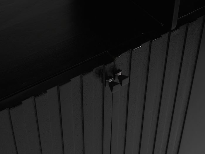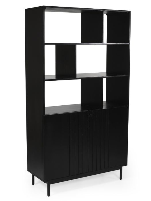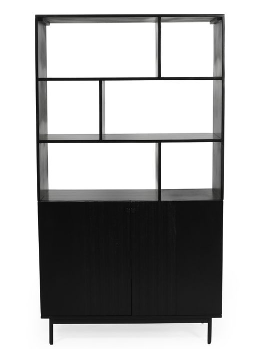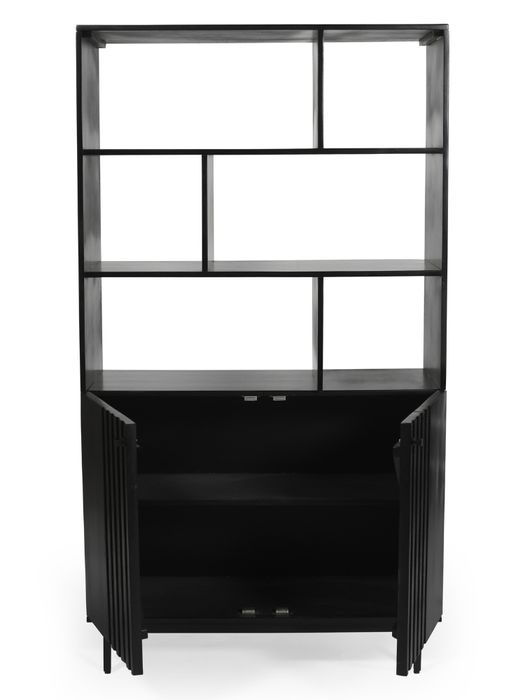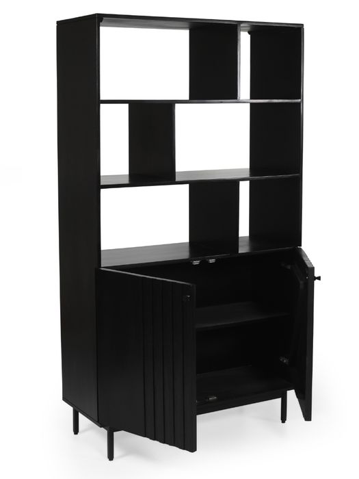 Das Bücherregal der FLUETE-Kollektion verbindet puristisches Design mit funktionaler Raffinesse. Handgefertigt aus massivem Akazienholz und veredelt mit einem tiefschwarzen Finish, setzt es in jedem Raum ein stilvolles Statement. Die klar gegliederten offenen Fächer bieten Platz für Bücher, Deko oder Geschirr, während die beiden Türen mit ihrer charakteristischen Lamellenfront für geschützten Stauraum sorgen. Ein moderner Mix aus handwerklicher Qualität und urbanem Design – perfekt für Wohn-, Ess- oder Arbeitsbereiche.
