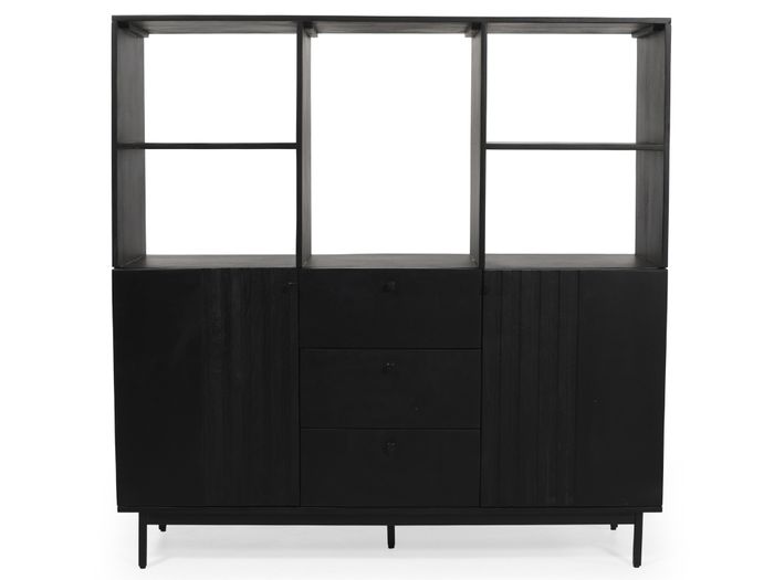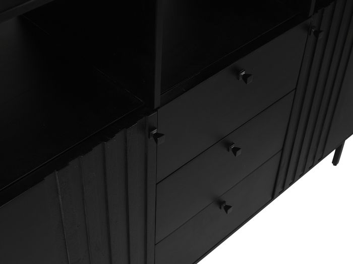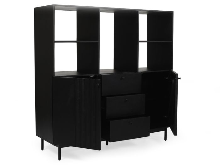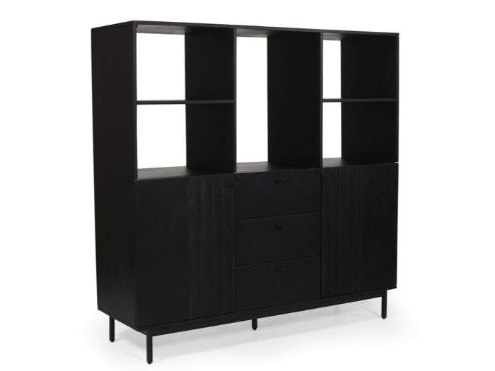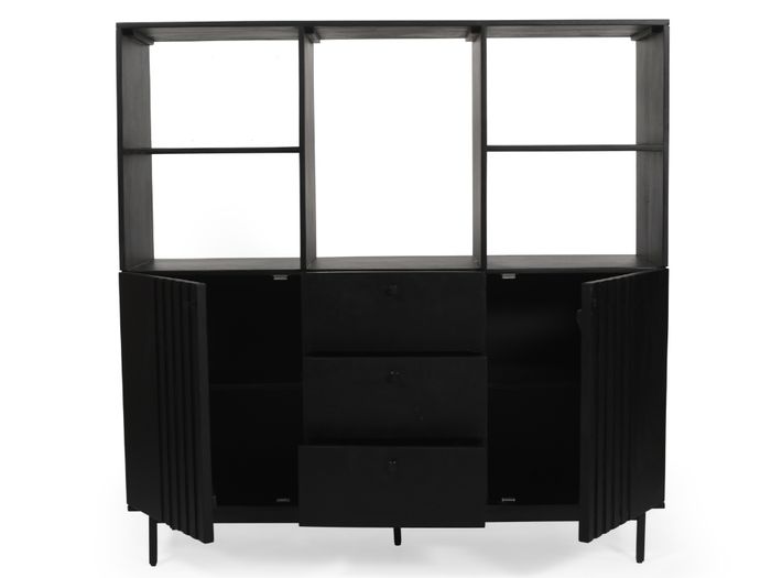 Das Highboard aus der FLUETE-Kollektion vereint moderne Architektur mit handwerklicher Präzision. Gefertigt aus massivem Akazienholz und veredelt in elegantem Schwarz, beeindruckt es durch seine ausgewogene Kombination aus offenen Ablagen, geschlossenen Türen und praktischen Schubladen. Die vertikal gefräste Lamellenstruktur verleiht der Front Tiefe und Charakter, während das schlanke Gestell das Möbel optisch leicht wirken lässt. Dieses Highboard bietet nicht nur großzügigen Stauraum, sondern setzt als stilvolles Statement-Piece in jedem Wohnraum Akzente.