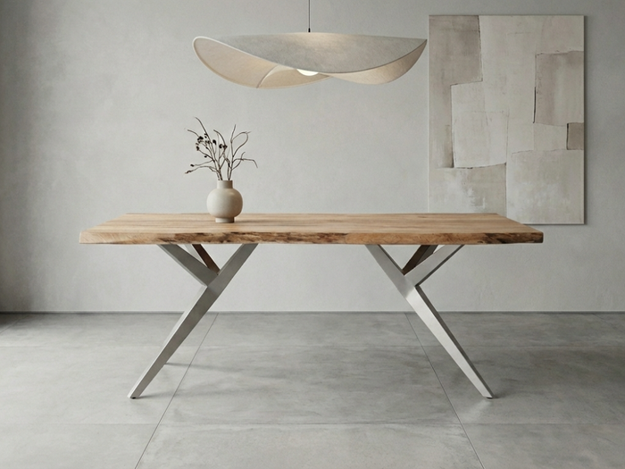 Dieser außergewöhnliche Esstisch verbindet natürliche Materialien mit modernem Industriedesign. Die 5,5 cm starke Tischplatte aus massivem Mangoholz überzeugt durch ihre warme Farbgebung "latte" und die charakteristische Baumkantenoptik, die jedes Exemplar zu einem Unikat macht. Getragen wird die massive Platte vom zweiteiligen Untergestell „Fly“ aus robustem Eisen in Silber matt, das dem Tisch eine elegante Leichtigkeit und hohe Stabilität verleiht. Mit einer Tischplattengröße von 180 × 90 cm bietet der Esstisch komfortabel Platz für 6 Personen und eignet sich ideal für gesellige Runden im Esszimmer oder offenen Wohnbereich.