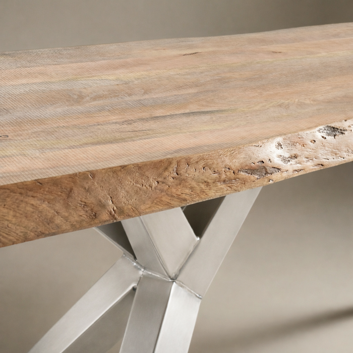 Massivholz Esstisch Baumkante "live edge" Mango latte 200x100 cm, Eisengestell Fly silber matt