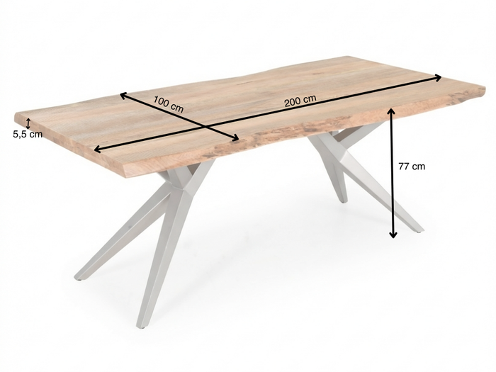 Dieser außergewöhnliche Esstisch verbindet natürliche Materialien mit modernem Industriedesign. Die 5,5 cm starke Tischplatte aus massivem Mangoholz überzeugt durch ihre warme Farbgebung "latte" und die charakteristische Baumkantenoptik, die jedes Exemplar zu einem Unikat macht. Getragen wird die massive Platte vom zweiteiligen Untergestell „Fly“ aus robustem Eisen in Silber matt, das dem Tisch eine elegante Leichtigkeit und hohe Stabilität verleiht. Mit einer großzügigen Tischplattengröße von 200 × 100 cm bietet der Esstisch komfortabel Platz für 6–8 Personen und ist ideal für gesellige Abende, Familienessen oder besondere Anlässe.
