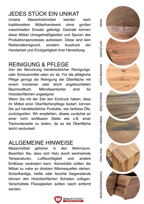 Massivholzmöbel gehören in den Wohnraum. Bei unsachgemäßer Lagerung oder Aufstellung in feuchter oder kalter Umgebung können die Möbel Schaden nehmen. Beachten Sie bitte, dass sich Holz durch wechselnde Temperaturen, Luftfeuchtigkeit und andere Einflüsse verändern kann. Trotz sorgfältiger Holzauswahl und Verarbeitung kann es vor-kommen, dass sich Seitenteile und Platten leicht verziehen, auch Risse sind möglich. All diese Auswirkungen sind keine Reklamationsgründe, sondern Zeugnis der Natürlichkeit. Keinesfalls sollten die Möbel zu nahe an direkten Wärmequellen stehen.