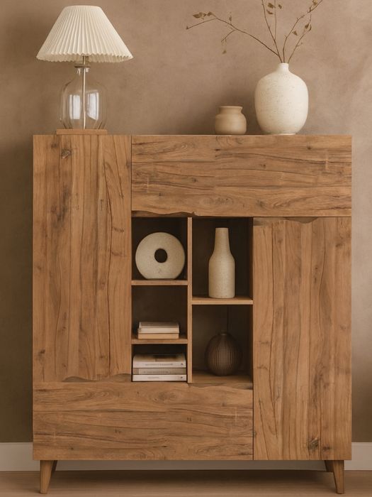 Man möchte sogar noch ein Ausrufezeichen hinter diese Linie setzen: LIVE! Lebe! Jung, modern, lebenslustig wirken diese Möbel aus Akazienholz. Eine lockere und lebhafte Linie, die Gemütlichkeit und Lebensfreude ausstrahlt. Außergewöhnlich und auf jeden Fall ein Blickfang. Das Highboard bietet jeder Menge Stauraum hinter 4 Türen und präsentiert dank der 5 offenen Fächer gekonnt Ihre Lieblingsstücke.