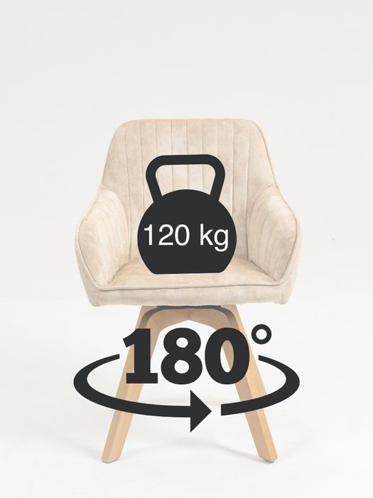 Der Stuhl Gail vereint modernes Design mit gemütlicher Eleganz. Die weiche, samtige Polsterung in warmem Beigeton und die markante Rillensteppung machen ihn zum stilvollen Highlight in jedem Raum. Dank seiner 180-Grad-Drehfunktion mit praktischer Rückstellmechanik bietet Gail zusätzliche Bewegungsfreiheit und kehrt nach dem Aufstehen automatisch in die Ausgangsposition zurück – ideal für dynamisches Sitzen im Alltag. Die stabilen Holzbeine sorgen für sicheren Stand und setzen natürliche Akzente. Ob im Esszimmer, Home-Office oder als Eyecatcher im Wohnzimmer – Gail ist der perfekte Mix aus Komfort, Funktionalität und Design.