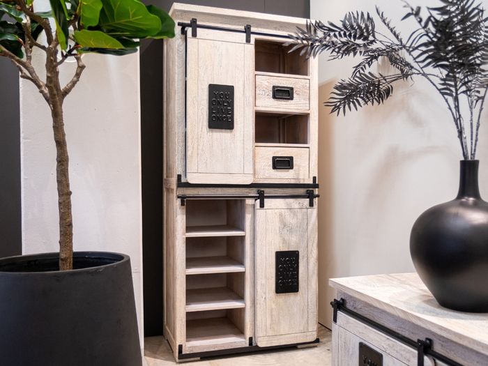 Industrielle Akzente sowie jede Menge Stauraum schafft SLIDE durch Schiebetüren, Eisenbeschläge, massives Mangoholz und schlichtes Design.