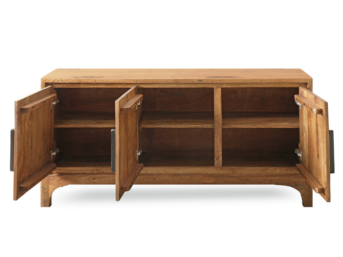 Markant und massiv präsentiert sich die VIENNA Kommode mit rauer Patina auf abgerundetem Gestell, welches den massiven Stauraummöbeln aus Mangoholz die nötige Leichtigkeit verleiht. Mit ihren markanten Metall-Applikationen und der natürlichen Holzmaserung wird sie zum Blickfang in jedem Wohnraum. Hinter den drei Türen bietet sie viel Stauraum für Geschirr, Textilien oder persönliche Gegenstände – und ist dabei bereits komplett montiert.