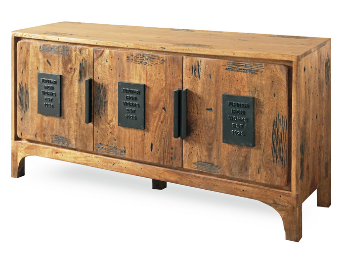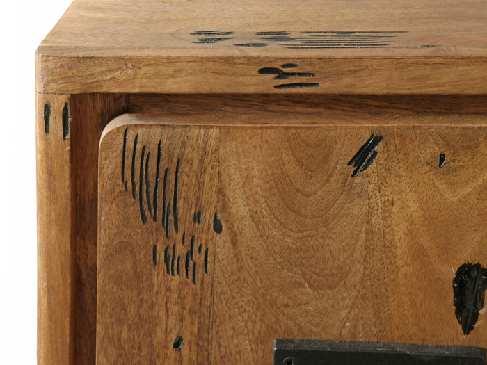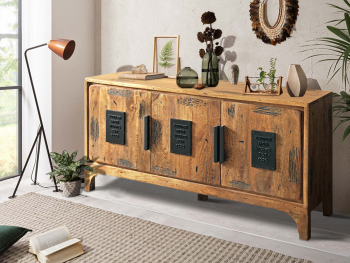 Die Möbelserie VIENNA aus massivem Mangoholz vereint handwerkliche Qualität mit markantem Industriedesign. Jedes Stück ist von Hand gearbeitet und trägt die natürliche Maserung sowie feine Gebrauchsspuren, die dem Holz seine besondere Ausstrahlung verleihen. Die schwarzen Metallgriffe und dekorativen Platten mit Prägung setzen einen kraftvollen Kontrast und unterstreichen den unverwechselbaren Charakter dieser Kollektion.