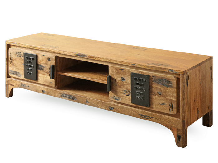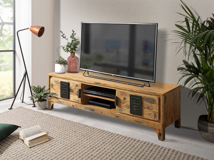Dieses Lowboard aus massivem Mangoholz bringt rustikale Eleganz in Ihr Wohnzimmer. Die handgearbeitete Oberfläche mit charakteristischen Gebrauchsspuren und die markanten Metall-Details im Industrial-Stil machen das Möbelstück zu einem besonderen Highlight. Hinter zwei Türen und in offenen Fächern bietet es praktischen Stauraum für Technik, Medienzubehör und vieles mehr. Durch die Kabelöffnung auf der Rückseite bleibt die Ordnung stets gewahrt. Das Lowboard wird komplett montiert geliefert – aufstellen, anschließen und genießen.
