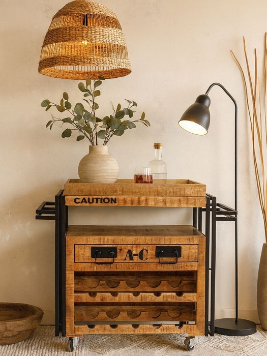 Eine besondere Linie für Individualisten: Das grob gesägte und anschließend lackierte Mangoholz entfaltet im Eisenrahmen seine ganze Wirkung. Markante Möbel mit starkem Charakter! Der IRON Küchenwagen von WOLFMÖBEL ist ein must-have für alle Liebhaber des industriellen Stils. Hergestellt aus hochwertigem Mangoholz und Eisen in der Farbe mana, ist dieser Küchenwagen nicht nur ästhetisch ansprechend, sondern auch äußerst funktional. Mit 2 großzügigen Ablageflächen, Handtuchhaltern und ausreichend Platz für bis zu 10 Flaschen bietet der IRON Küchenwagen viel Stauraum und Organisationsmöglichkeiten. Die obere Ablage ist abnehmbar und kann als Tablett genutzt werden, was die Flexibilität dieses Möbels noch weiter erhöht. Dank seiner Rollen ist der IRON Küchenwagen leicht zu bewegen und kann daher nicht nur in der Küche, sondern auch als Beistellwagen am Esstisch oder zum Grillen genutzt werden. Dieses handgearbeitete Massivholzmöbel wird fertig aufgebaut geliefert, sodass Sie es sofort in Betrieb nehmen können.
